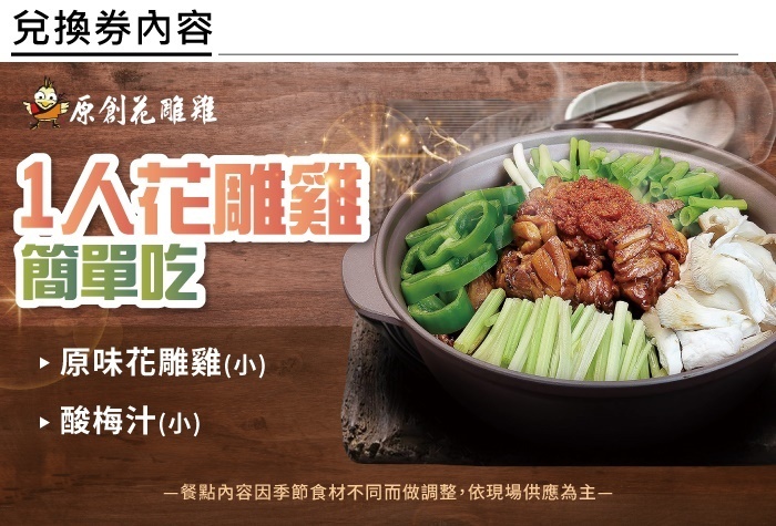 1.單張券可1人至原創花雕雞享花雕雞簡單吃(已含服務費)。餐點內容:原味花雕雞(小)+酸梅汁(小)★餐點內容因季節食材不同而做調整,依現場供應為主。*2024/11/30前持本券消費加贈花雕滷肉飯1碗、每日主廚小菜1份。*2024/11/16~2024/12/20持本券消費加贈每日主廚小菜1份。
