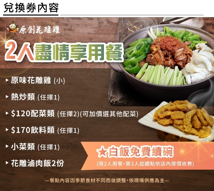 1.單張券可2人至原創花雕雞享盡情享用餐(已含服務費)。