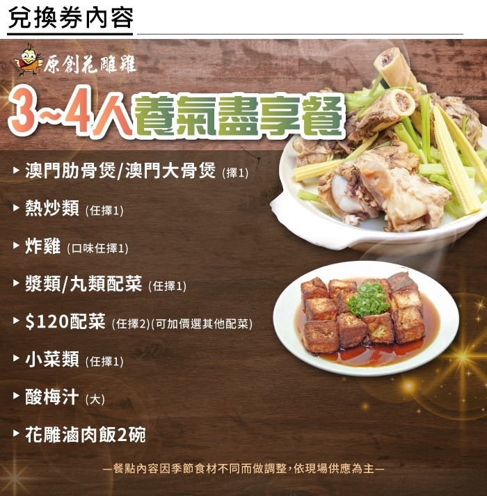 1.單張券可3~4人至原創花雕雞享養氣盡享餐(已含服務費)。