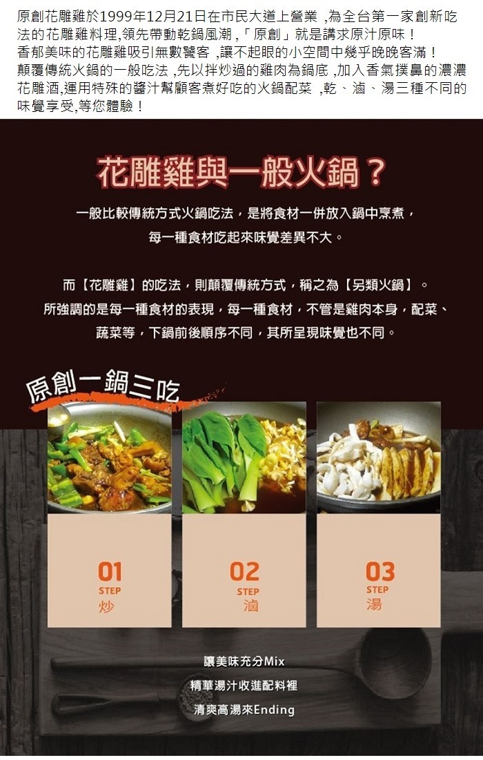 原創花雕雞在2000年12月21日即開始營業,當時另有其名,、最原始的老味道,這箇中的滋味只有老饕能體會。「吃到」、「看到」、「聽到」、「服務得到」是原創花雕雞的四大絕招。