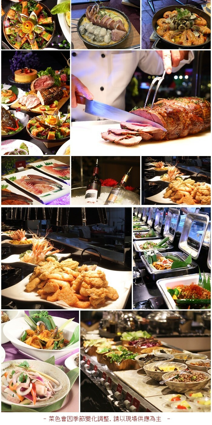 擁有300坪寬大空間、300席舒適座位區,餐檯規劃有細緻功夫、極鮮時令食材的日本料理區、現烤現切大口吃肉的歐美海陸料理區,以及有美食天堂之稱的亞洲料理,更貼心為外食族、上班族準備了健康高纖蔬果沙拉區,另外值得一嚐的是精品中的甜點、飲品及冰淇淋,還有飯店自製的手工甜品等,多樣豐富的美食佳餚道道滿足您的味蕾!