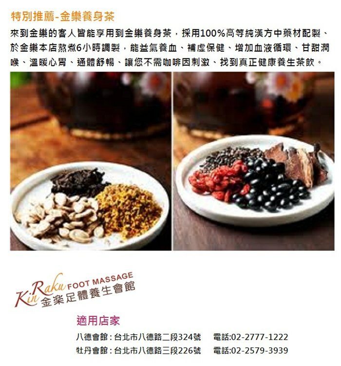 1. 本券限1人可至金樂足體養生會館(牡丹會館)享受足體按摩30分鐘。加贈泡腳+肩頸熱敷10分鐘,及現金禮券100元限下次使用,本券已包含10%服務費用。