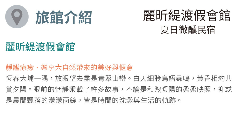 位置:位於台灣屏東縣恆春鎮大埔路16-2號,鄰近田野與自然景觀,環境清幽,靜謐放鬆。