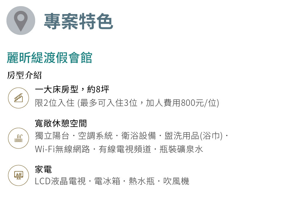 設施與特色:每間房間都有陽台和落地窗,可俯瞰自然景色;設施含免費停車、公共休息區、烤肉區、卡拉OK、戲水池等,非常適合度假型住宿。