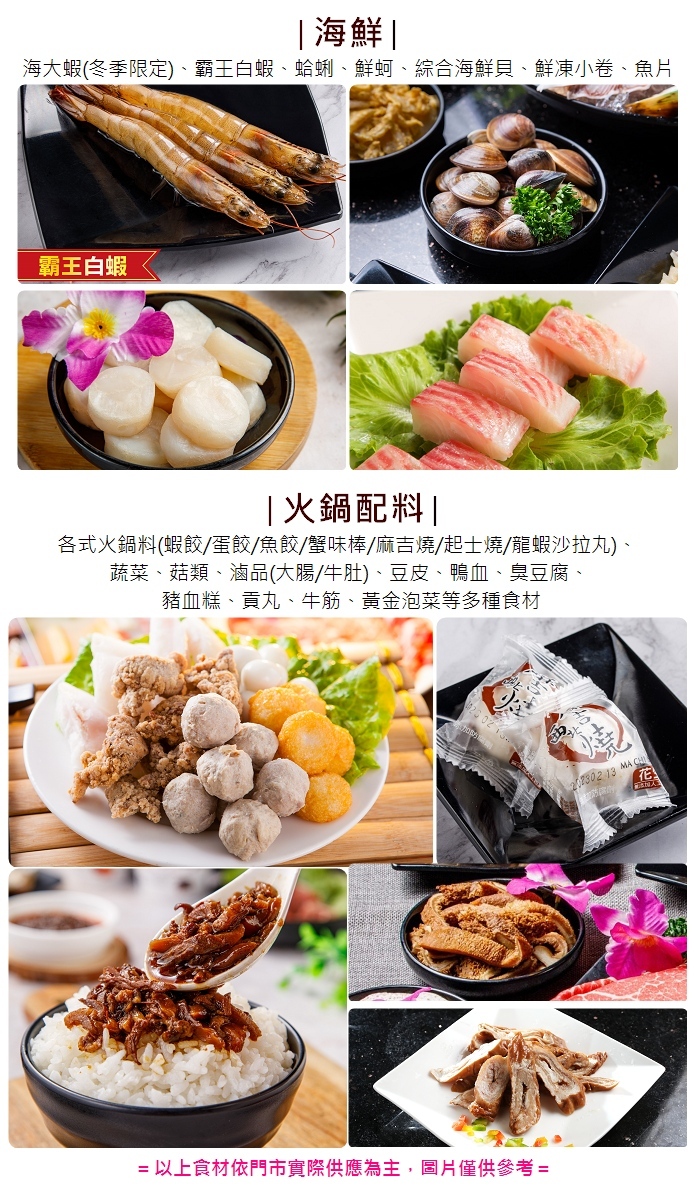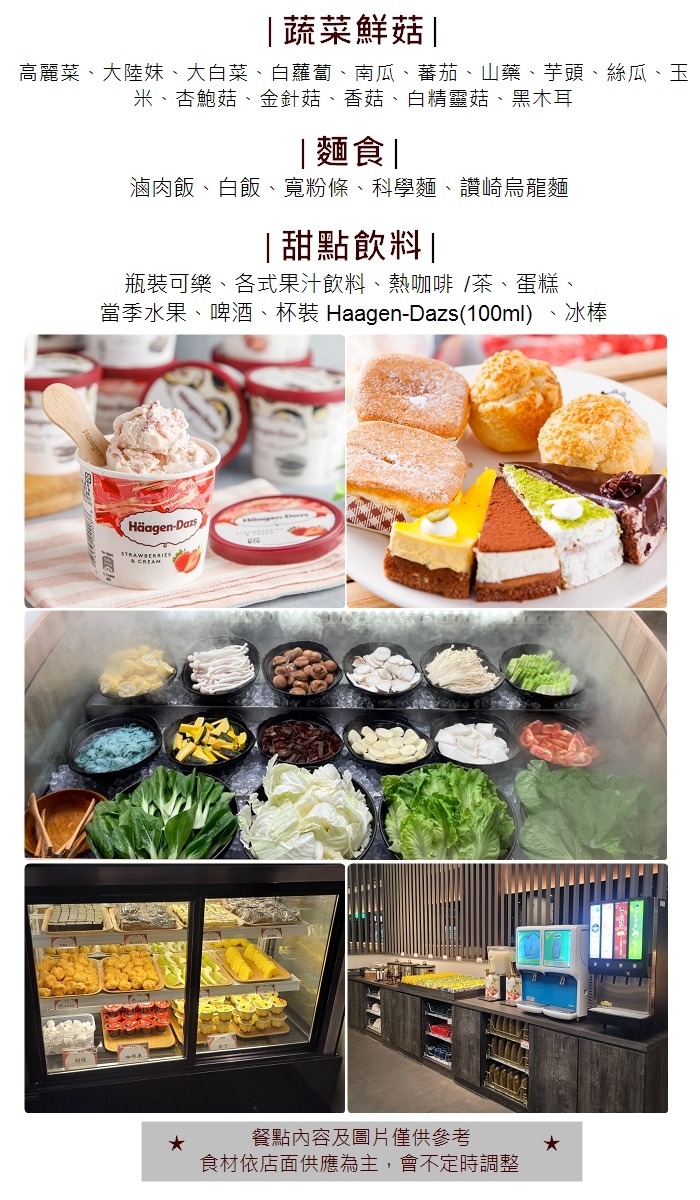 〈無限量供應:豪華肉品、海鮮、火鍋配料、蔬菜、主食、飲料、蛋糕甜點、冰淇淋等〉