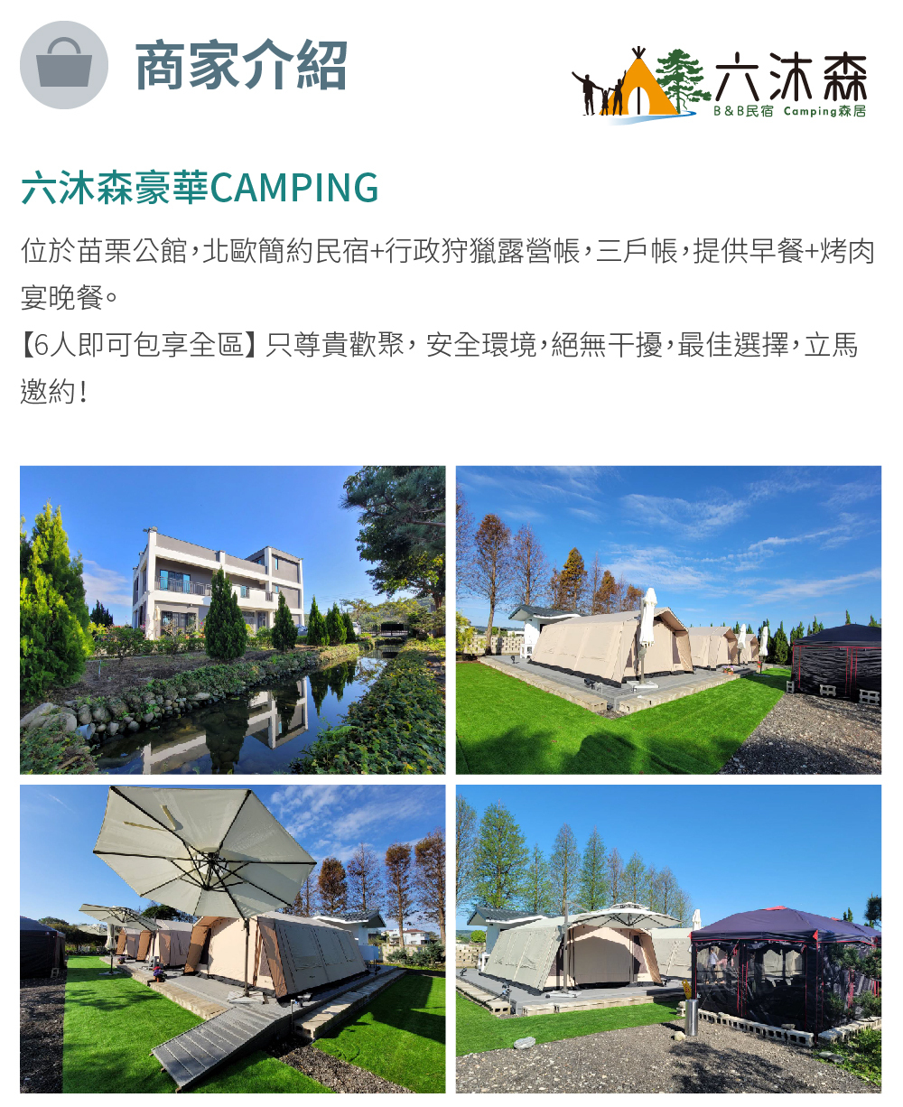 位於苗栗公館,北歐簡約民宿+行政狩獵露營帳,一間房+三戶帳,提供早餐+烤肉宴晚餐。