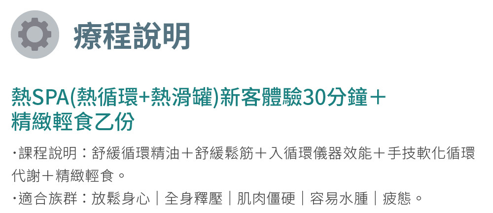 熱SPA(熱循環+熱滑罐)新客體驗30分鐘+精緻輕食乙份