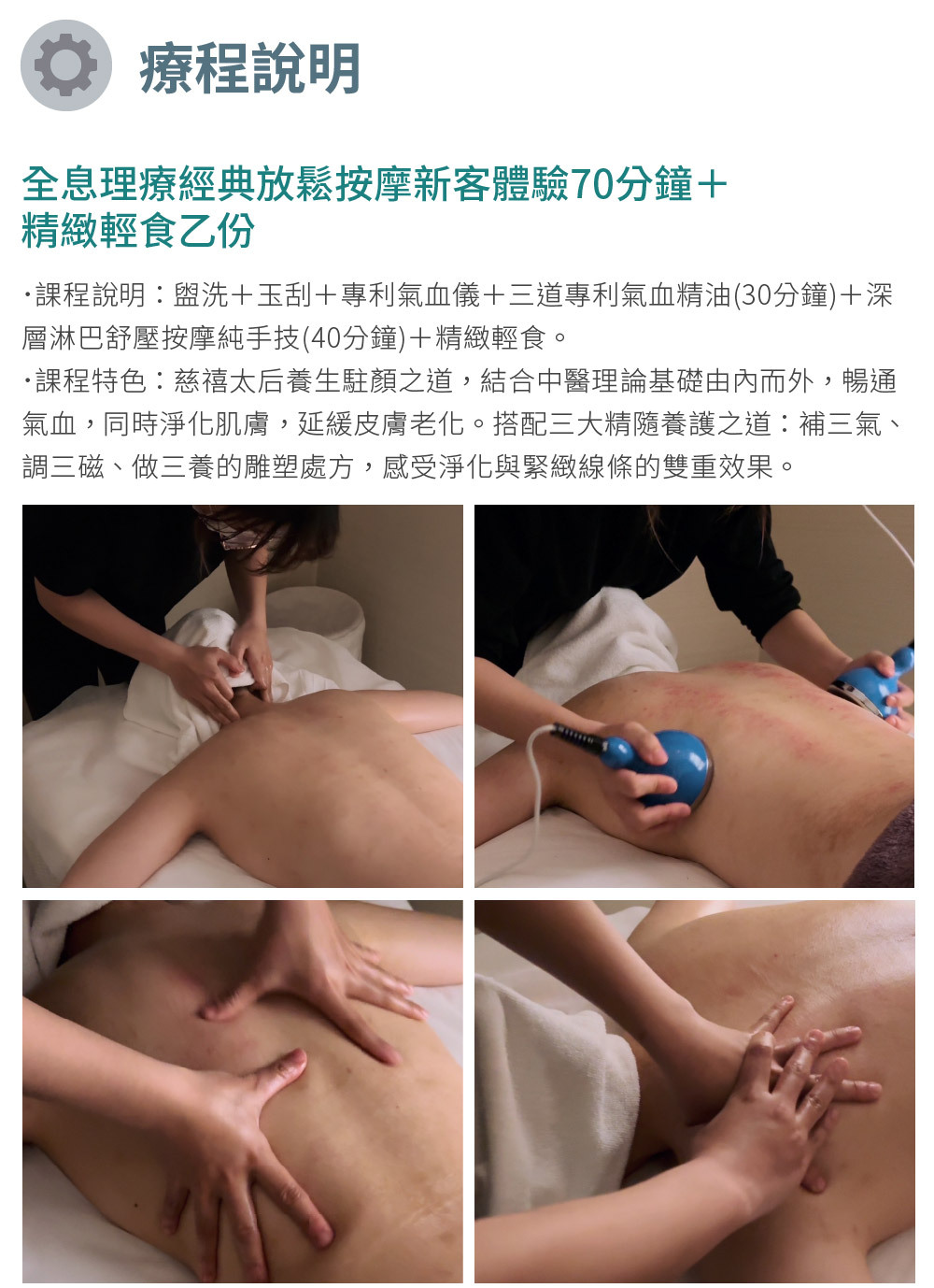 課程說明:盥洗+玉刮+專利氣血儀+三道專利氣血精油(30分鐘)+深層淋巴舒壓按摩純手技(40分鐘)+精緻輕食。