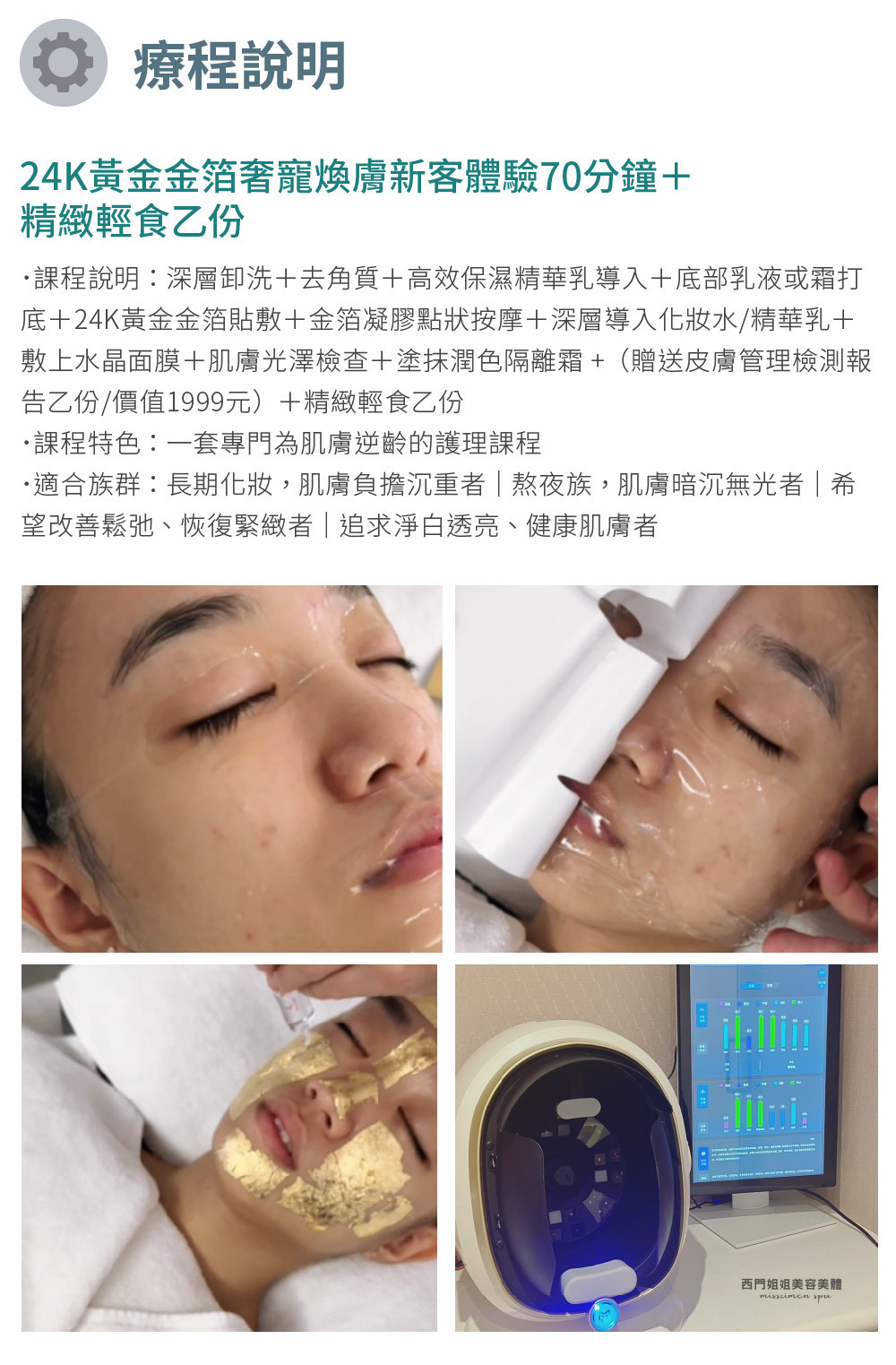 課程說明:深層卸洗+去角質+高效保濕精華乳導入+底部乳液或霜打底+24K黃金金箔貼敷+金箔凝膠點狀按摩+深層導入化妝水/精華乳+敷上水晶面膜+肌膚光澤檢查+塗抹潤色隔離霜 +(贈送皮膚管理檢測報告乙份/價值1999元)+精緻輕食乙份。