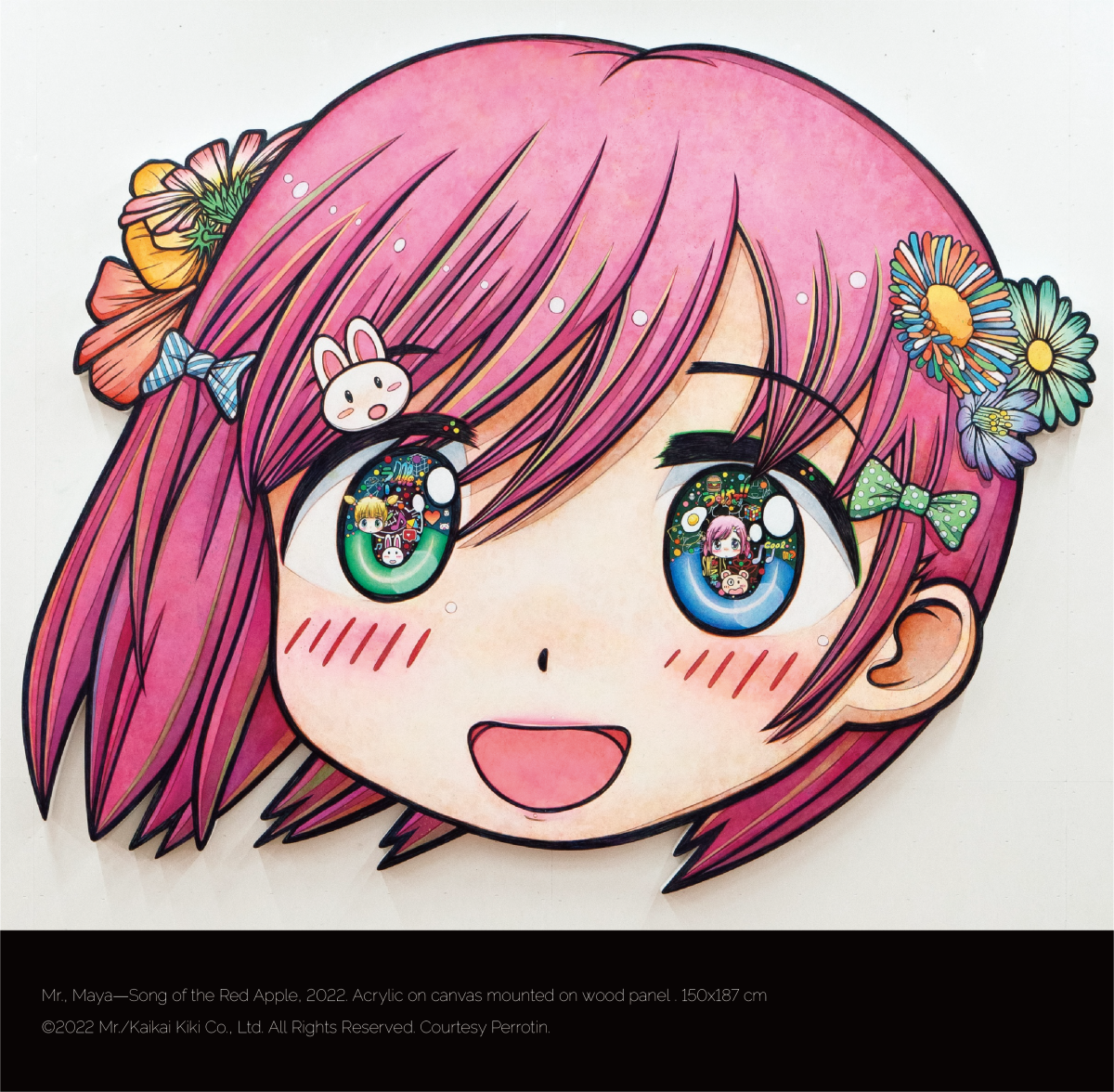 Mr. 的少女角色多以正面、水平的姿態呈現,讓觀者得以用平等的距離與其相遇,展現既絢麗又混沌的世界觀。2000 年代,他投入大尺幅壓克力畫的繪製,將少女形象置於細膩風景之中,揉合動畫與浮世繪美學交織的視覺景觀,揭示日本「可愛」文化下的複雜文化語境。近年來,Mr. 的作品不僅停留於華麗與可愛,也呈現日本東北大地震後的焦灼與不安。他將「秩序」與「混沌」、幸福與破壞並置,寄託於少女的形象之中。透過此種視覺語言,Mr. 不僅塑造了個人風格,更折射出當代日本文化的核心狀態。可以說,他將傳統繪畫的「秩序」與現代日本社會的「混沌」相混合,並巧妙地調和兩者,藉此催生出多樣的動態體。