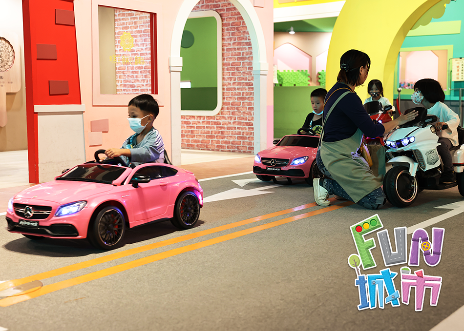 ▲ 「Fun城市展示廳」內有自由參觀的商店街及互動展品,更提供兒童電動機車、汽車等,讓民眾自由付費體驗。兒童可以實際騎乘、駕駛,在Fun城市的馬路上,認識紅綠燈號誌、交通標誌,練習「紅燈停、綠燈行」、「駕駛汽機車禮讓行人」等規則,透過遊戲經驗的學習與累積,將正確的交通安全守則觀念,融入小朋友的日常生活當中。