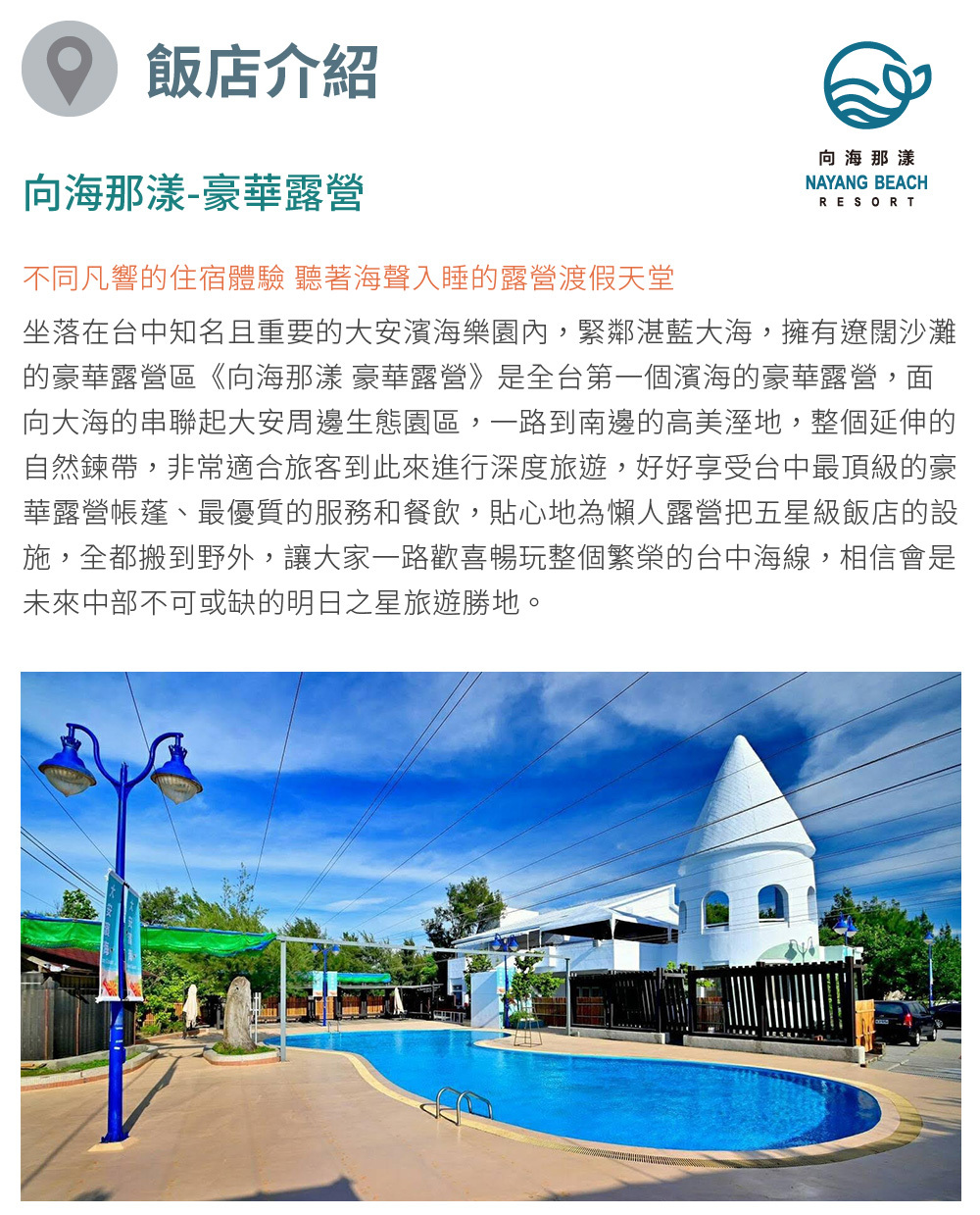 台中市大安濱海的休閒渡假勝地,結合豪華露營區、草皮遊憩區、生態教學導覽、DIY手作體驗、戶外戲水池與景觀餐廳等,全新詮釋濱海渡假風貌!