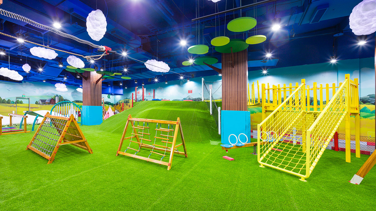 運動農場- 佔地300坪,吊橋繩梯、生動露營地、刺激滑草坡、擬真動物聚落、豐富草地遊樂場, Q軟彈跳雲、戶外大型打擊樂器,動靜皆宜享受閒適運動樂趣。