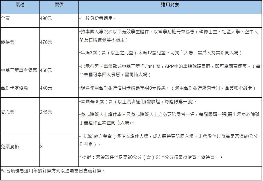 4.未滿3歲之兒童可免費入場,需由一位成人持票陪同入場。(需出示相關證件,未攜帶證件以是否滿90公分判定;年齡計算方式以進場參觀當日實歲計算)免票資格身分者,請於入場前主動出示證件供服務人員驗證,如不符資格請依身分購票;符合優惠身分者(優待票、愛心票)持票入場後,不可要求部分退款或貼補門票差額。
