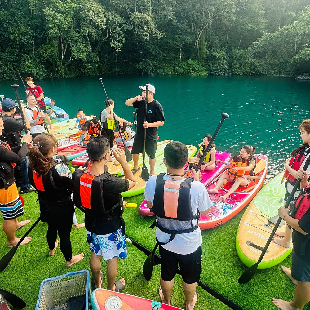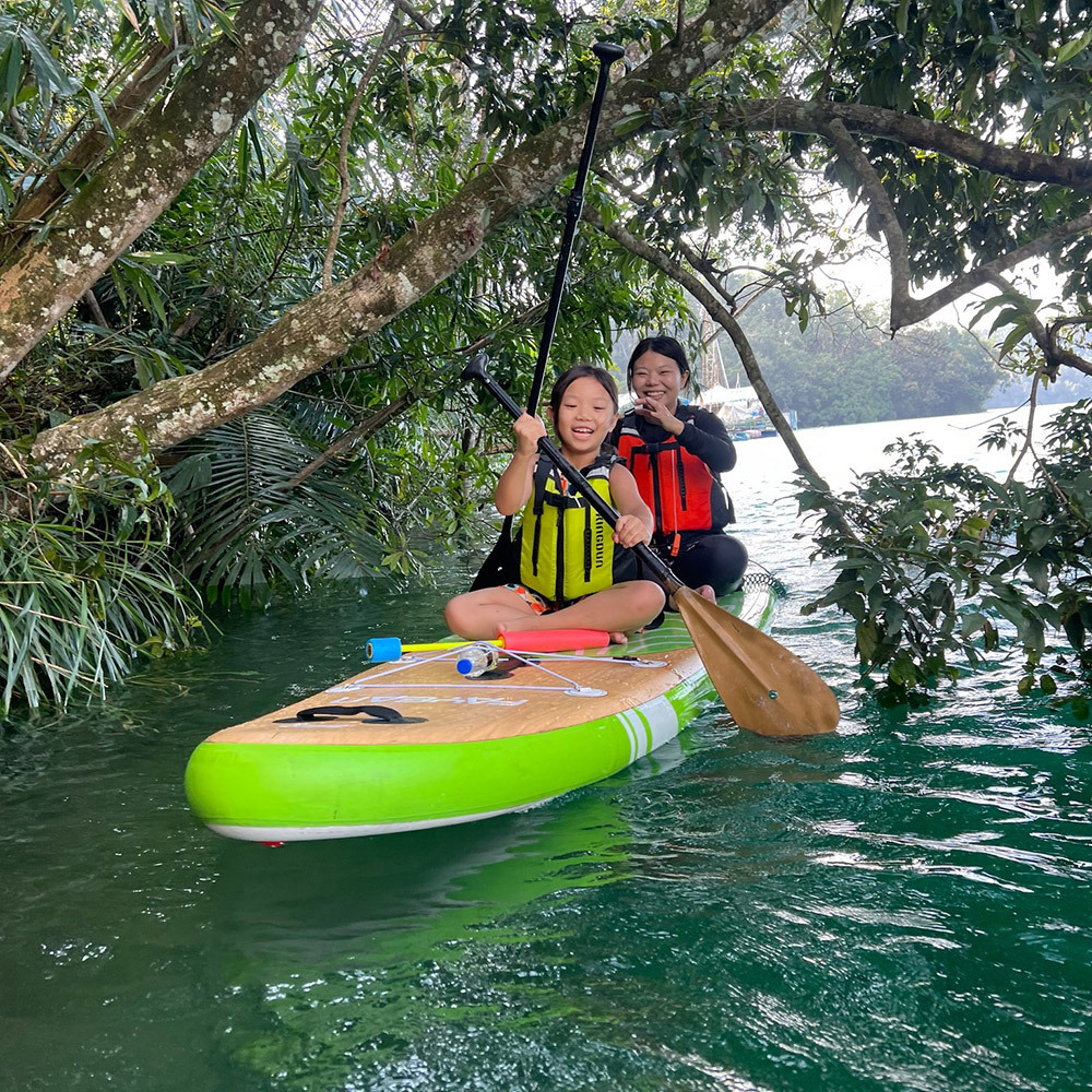 跟著教練的腳步,帶您穿越樹林小徑,聆聽鳥鳴聲,走入秘境,享受旅行的意義。由專業教練平台上教學,第一次體驗SUP立式划槳也可以輕鬆上手。店家選與平靜水域、清淨水質,無飯店遊艇干擾,本場安全且適合初學新手的體驗環境。設置獨立下水平台,提供換衣空間環境寬敞,適合老少咸宜一同參與的活動。活動中由教練隨團戒護、拍攝美麗的照片。