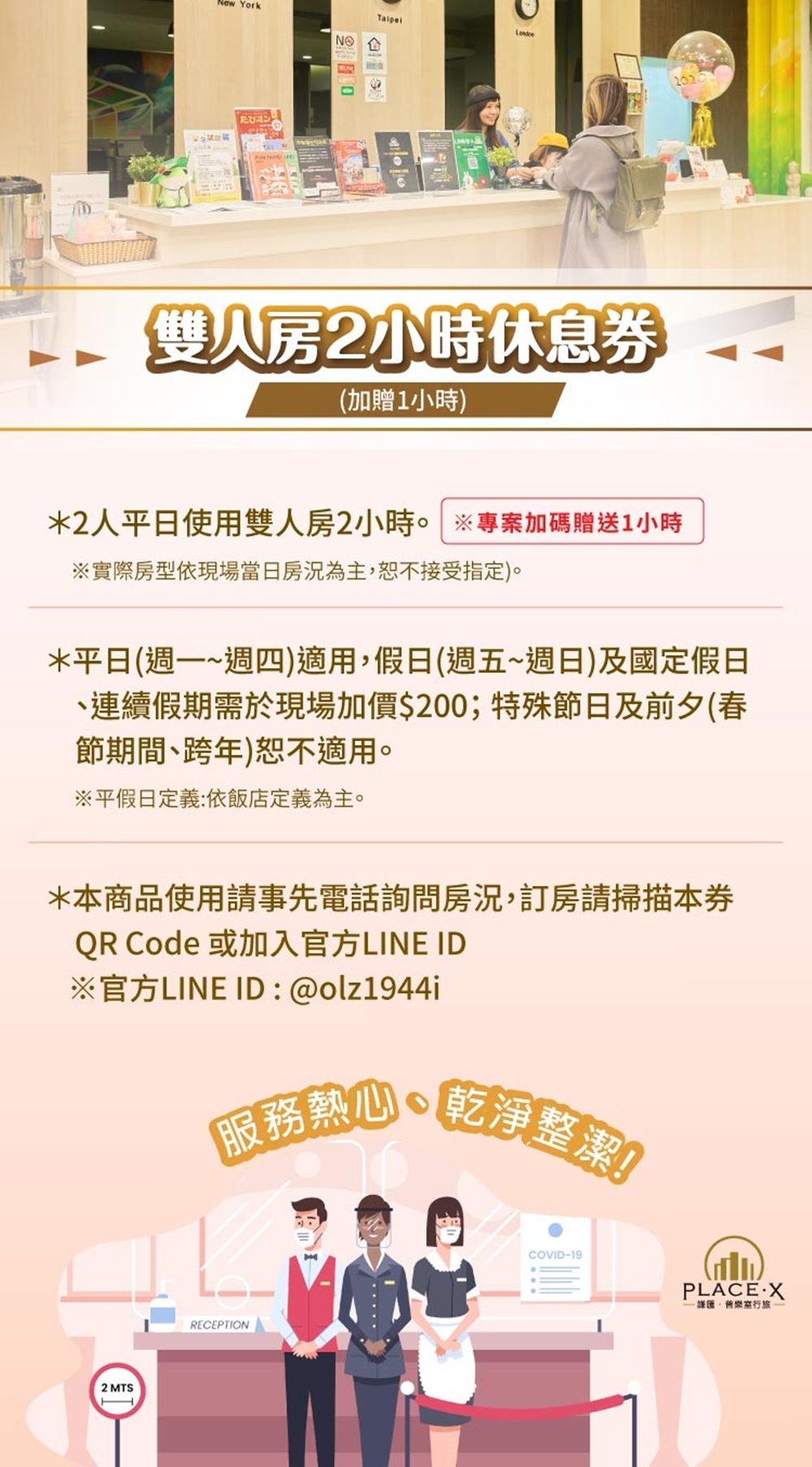 1.本券可2人平日使用雙人房2小時。※專案加碼贈送1小時。(實際房型依現場當日房況為主,恕不接受指定)。