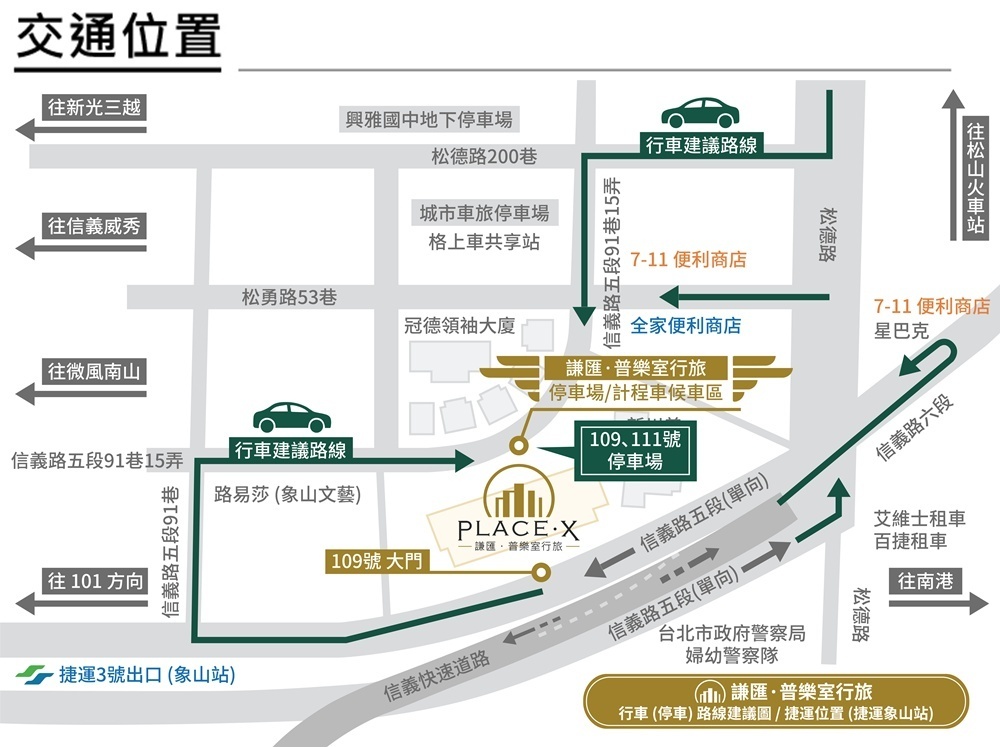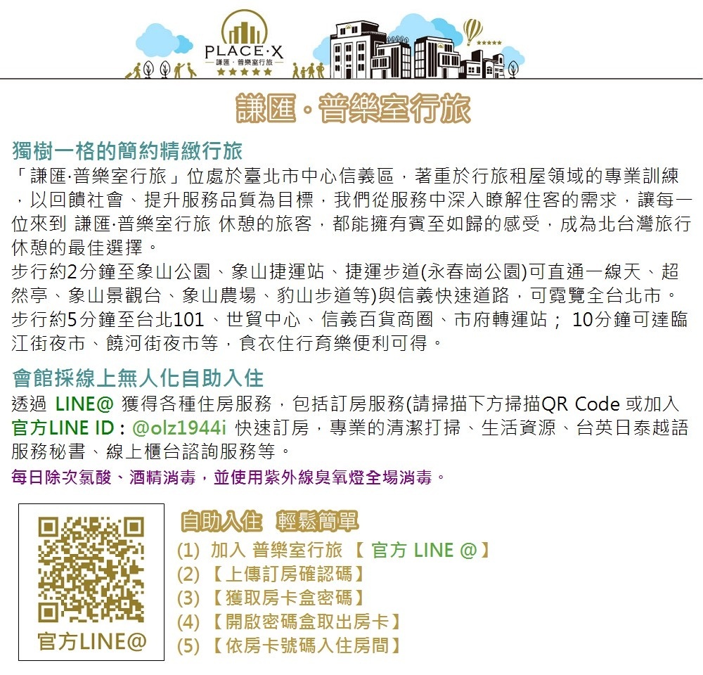 「謙匯·普樂室行旅」位處於臺北市中心信義區,成立於 2015 年,著重於行旅租屋領域的專業訓練,以回饋社會、提升服務品質為目標,我們從服務中深入瞭解住客的需求,讓每一位來到謙匯·普樂室行旅 休憩的旅客,都能擁有賓至如歸的感受,成為北台灣旅行休憩的最佳選擇。 步行約2分鐘即可達象山公園、象山捷運站、捷運步道(永春崗公園)可直通一線天、超然亭、象山景觀台、象山農場、豹山步道等)與信義快速道路,可霓覽全台北市。