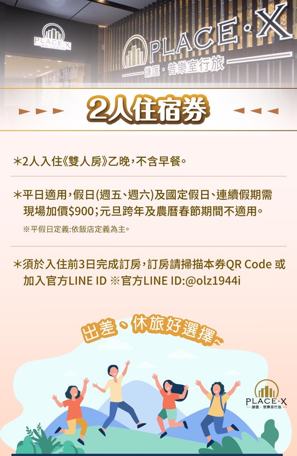 1.本券可2人於謙匯•普樂室行旅入住《雙人房》乙晚,不含早餐。