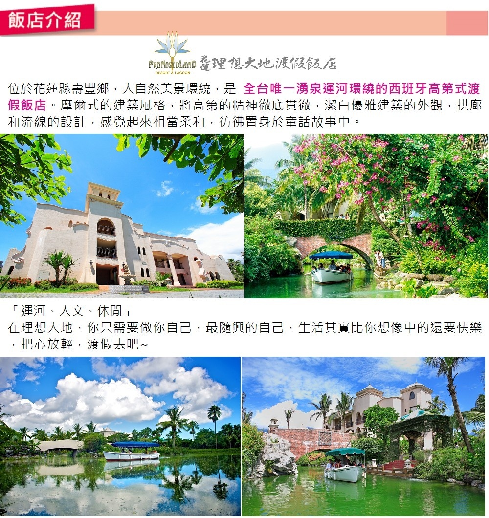 1. 本專案可四人入住理想大地-佛朗明哥豪華客房四人房乙晚(兩中床),含自助早餐4客、遊艇券4張、飯店免費活動設施使用及花蓮車站/花蓮機場至飯店定時接送乙次。