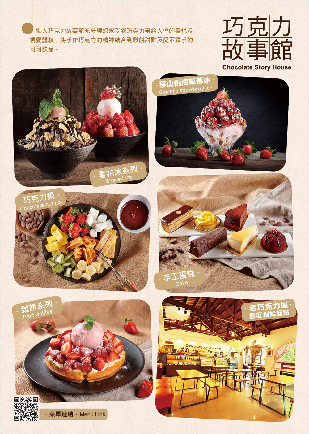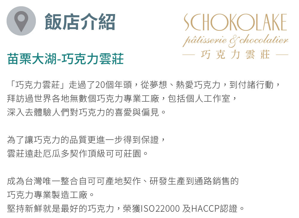 台灣唯一整合自可可產地契作、研發生產到通路銷售的巧克力專業工廠,提供各式美味高品質的巧克力、甜點與蛋糕,生巧克力更是長年的熱銷商品,可依據喜好選擇口味。