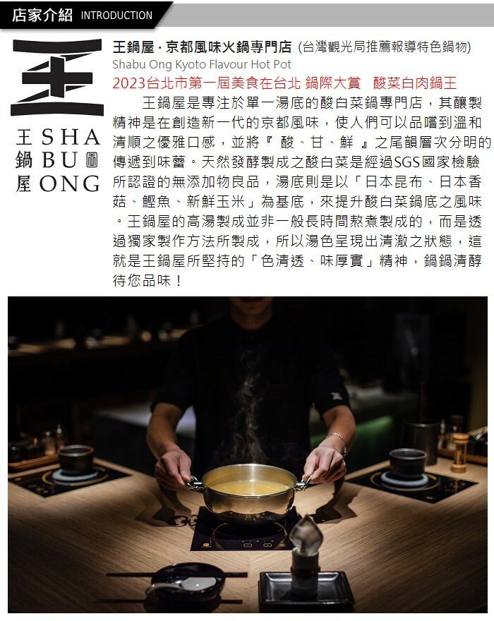 王鍋屋的釀製精神是在創造新一代的京都風味,使人們可以品嚐到溫和清順之優雅口感,並將『 酸、甘、鮮 』之尾韻層次分明的傳遞到味蕾,王鍋屋所天然發酵製成之酸白菜是經過SGS國家檢驗所認證的無添加物良品。