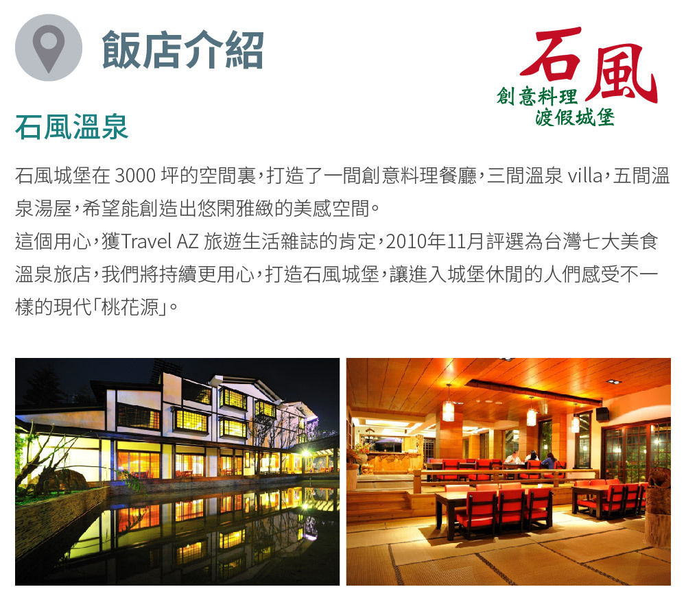 1. 本電子票券內容:石風城堡料理/人份+石湯入場門票一張。本券一般平、假日均可使用。