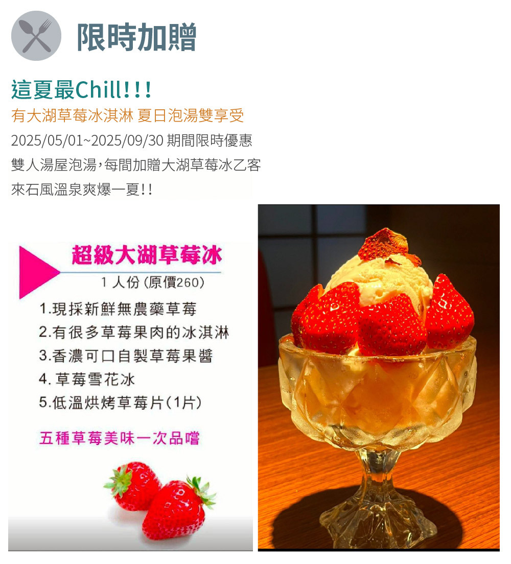 *夏季泡湯優惠(5月~9月)每間加贈超級大湖草莓冰一客(價值180元)