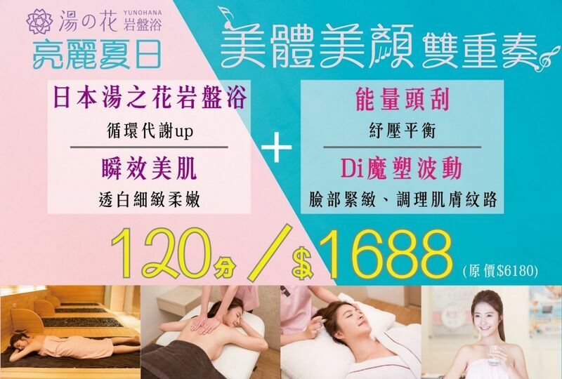 2.課程為日本岩盤浴+瞬效美肌65分鐘、能量頭刮15分鐘、DI魔塑波動40分鐘,共120分鐘。