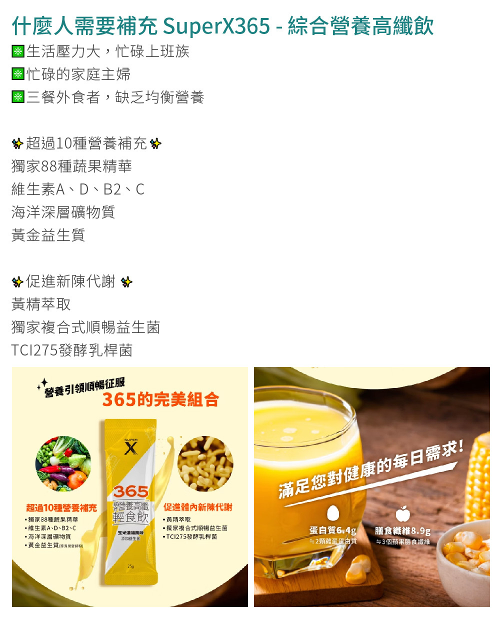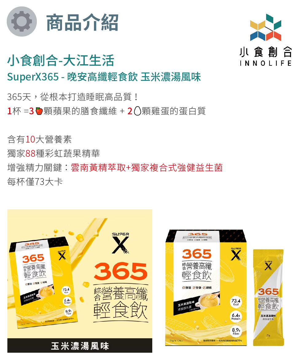 小食創合【大江生活】SuperX365 綜合營養高纖飲 玉米濃湯風味 10包/盒| 低卡低熱量 喝玉米濃湯也能順暢提神!線上宅配券