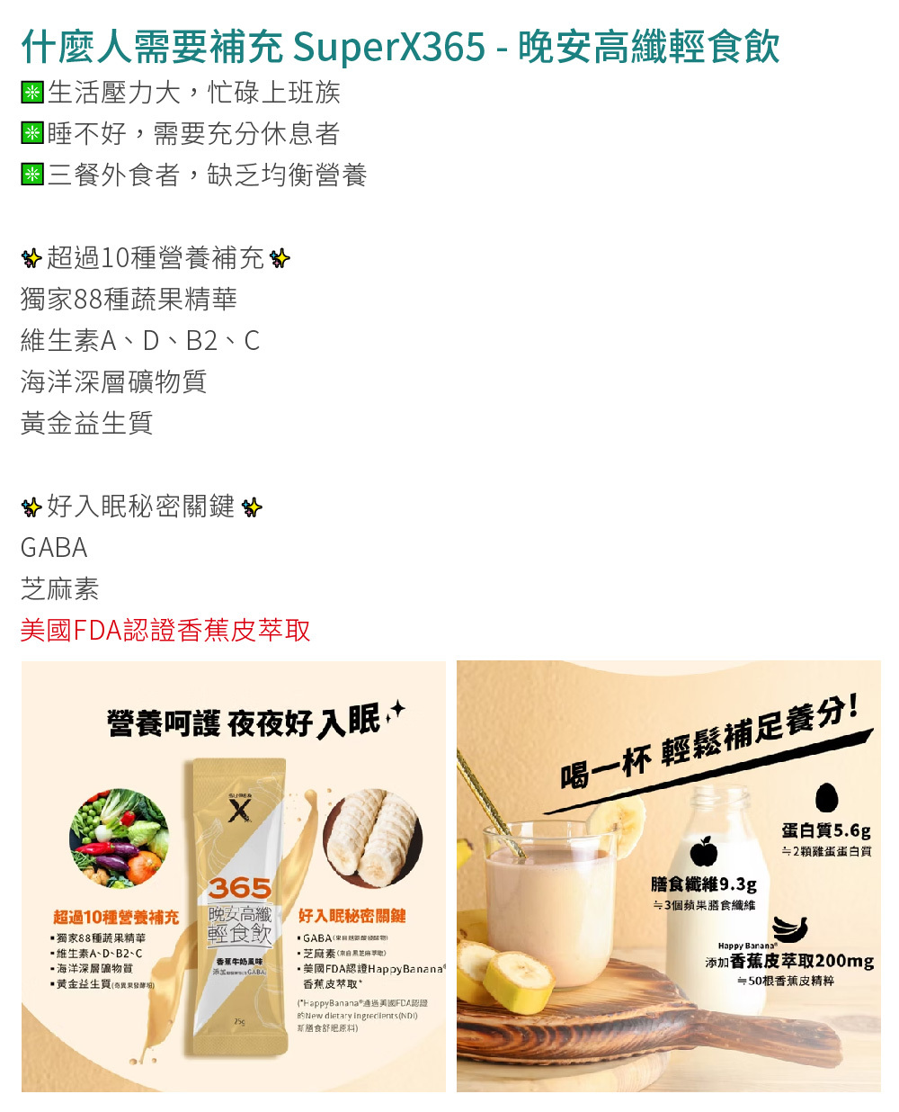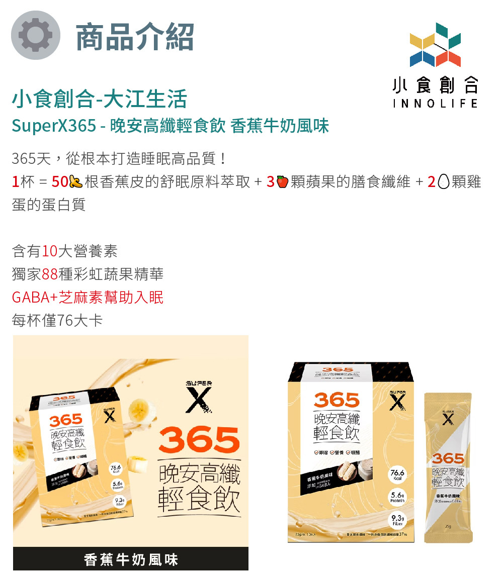 小食創合【大江生活】SuperX365 晚安高纖輕食飲 香蕉牛奶風味 10包/盒|一杯 = 50根香蕉皮的舒眠原料萃取線上宅配券