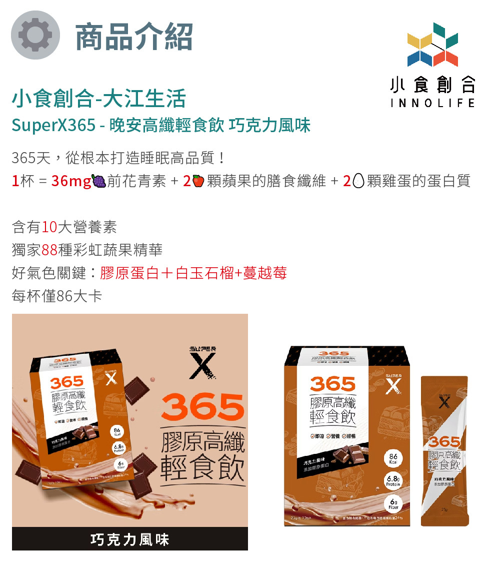 小食創合【大江生活】SuperX365 膠原高纖輕食飲 巧克力風味 10包/盒| 低卡低熱量 熱可可也能越喝越美!線上宅配券