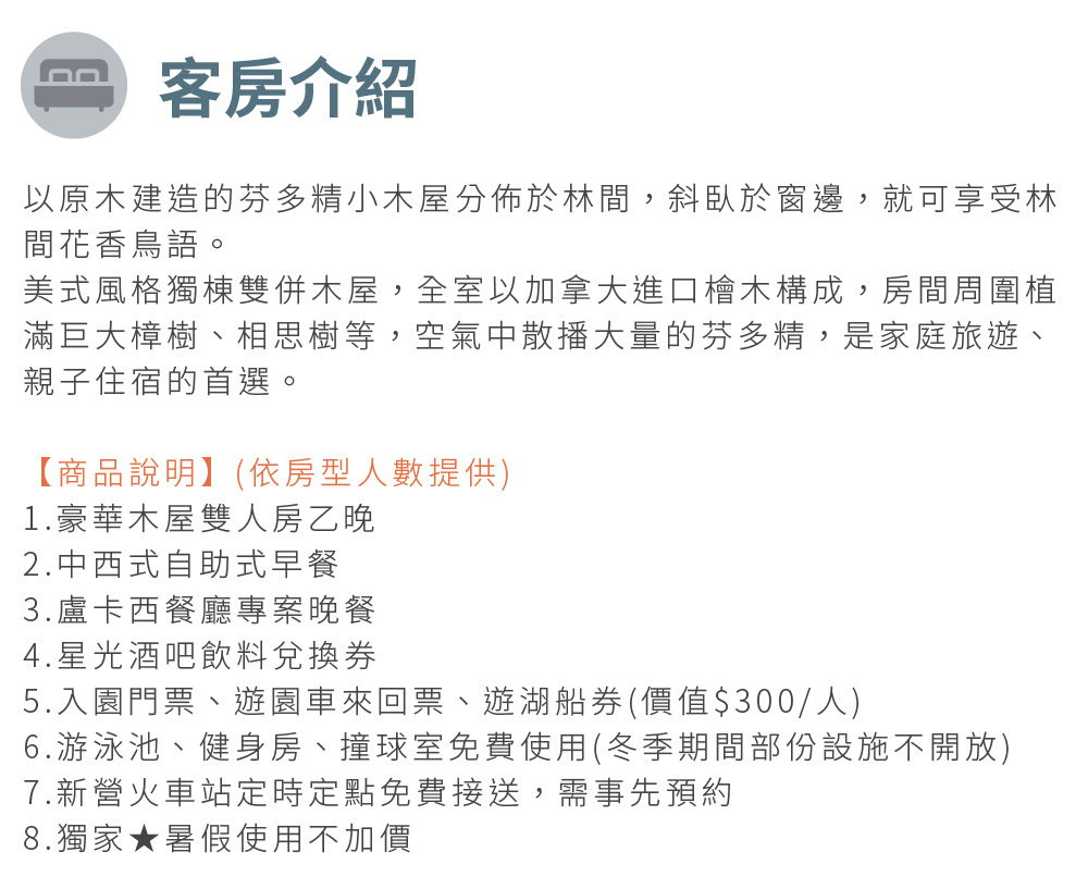 3.木屋及會館加人加收1,000元,醉月小樓加人加收1,500元,費用均含 (盥洗毛巾及專案內容,依房型空間大小不同,每房至多可加2位)