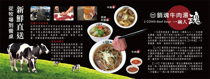 “二牛”代表店家的雙重堅持,牛肉湯美味的本質:新鮮、安全的牛肉;如同牛一樣的堅持個性,堅持“源於府城,忠於原味,精於創新”。