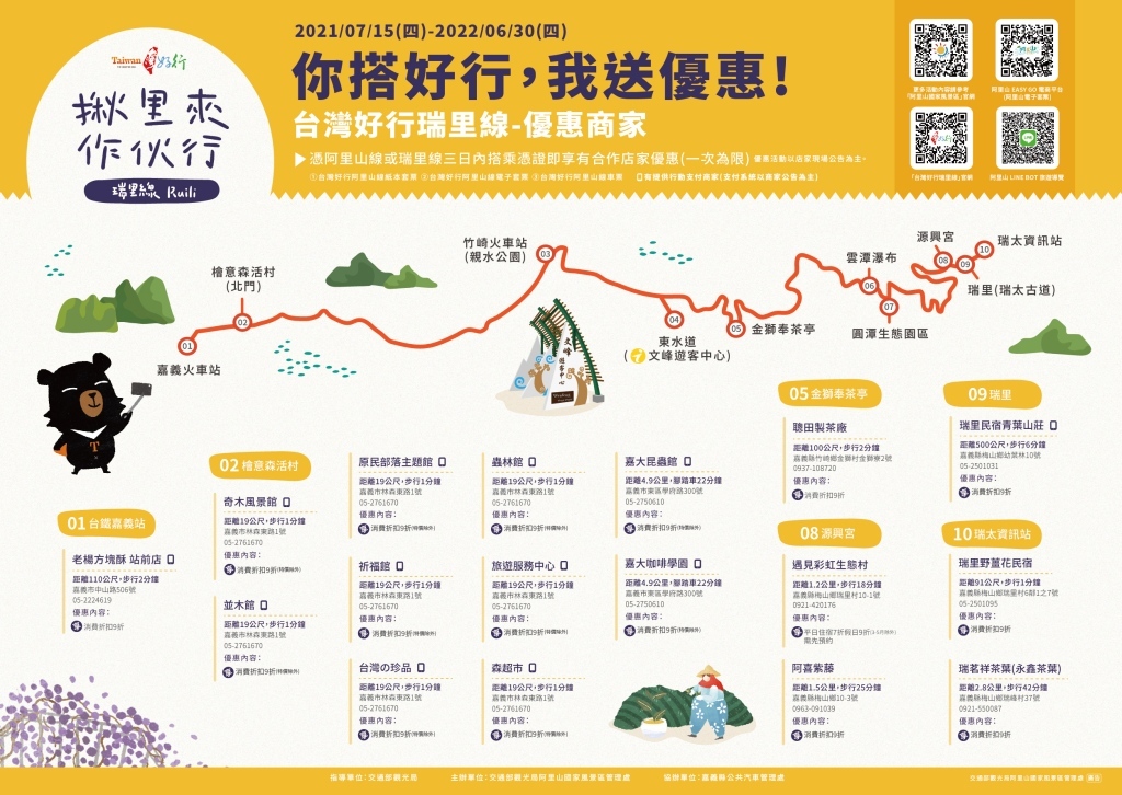 購買之票種可搭乘阿里山瑞里線,可來回可上、下車3次,請於上車時出示QRCode給司機核銷後上車,限兩日內用畢。
