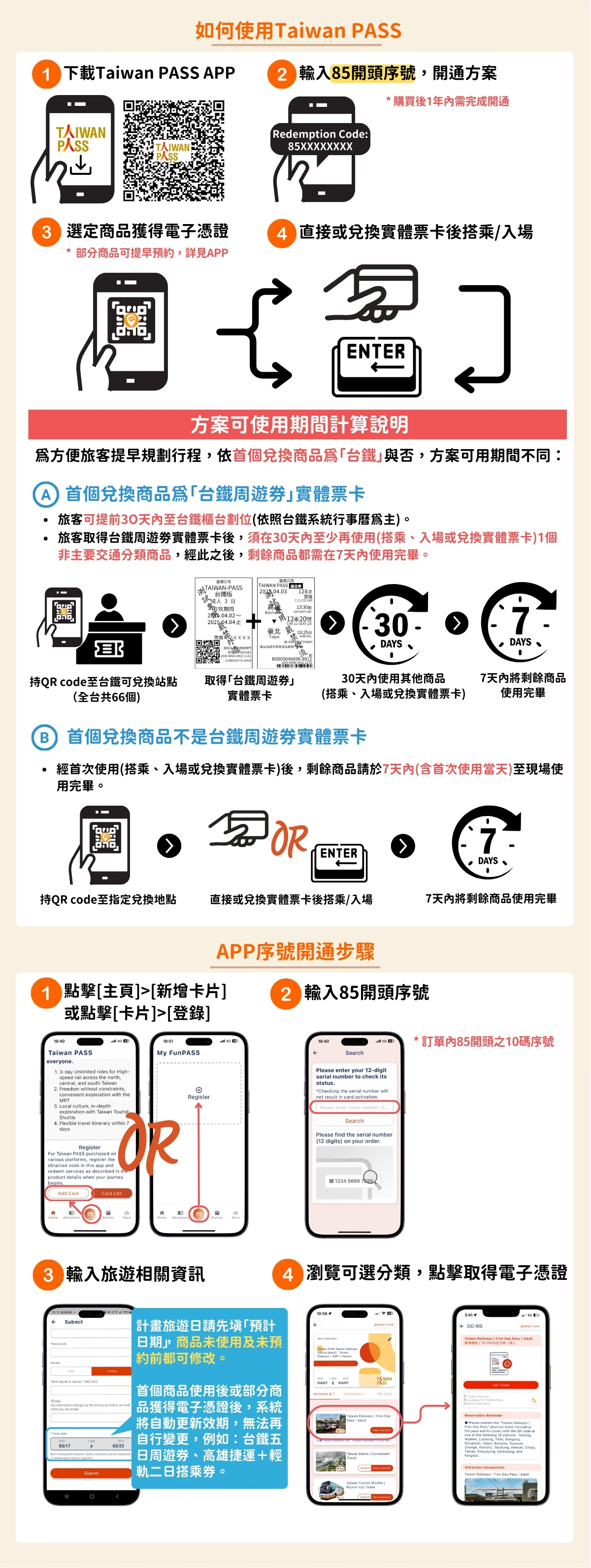 開通方案:需於購買套票後1年內,至APP輸入「訂單憑證中85開頭序號」完成方案開通。 例如:2025/1/1購買景點版方案,需於2026/1/1前至APP完成方案開通(APP畫面顯示上方卡片+下方商品分類列表)