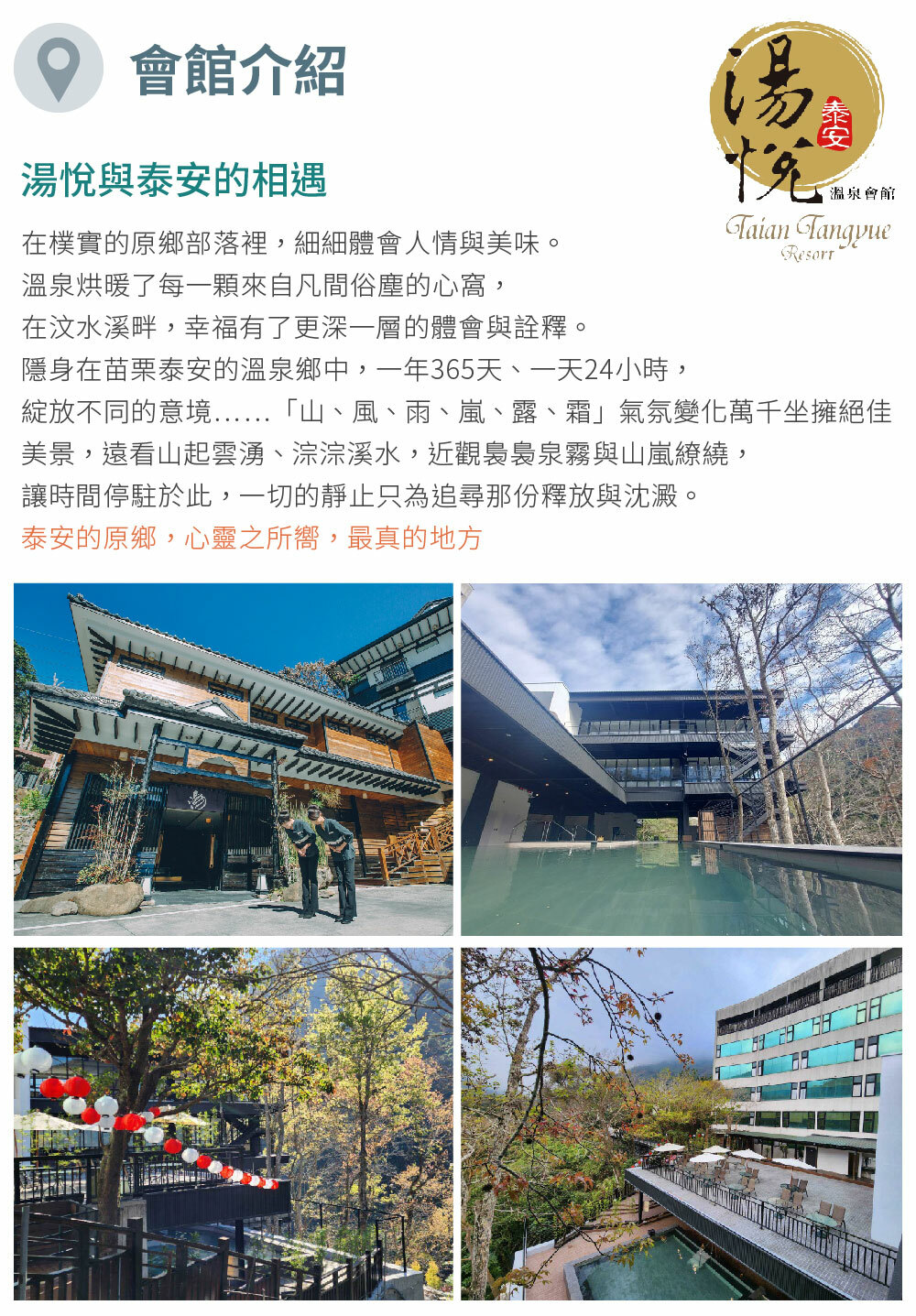 隱身在苗栗泰安的溫泉鄉中,一年365天、一天24小時,綻放不同的意境……「山、風、雨、嵐、露、霜」氣氛變化萬千坐擁絕佳美景,遠看山起雲湧、淙淙溪水,近觀裊裊泉霧與山嵐繚繞,讓時間停駐於此,一切的靜止只為追尋那份釋放與沈澱。