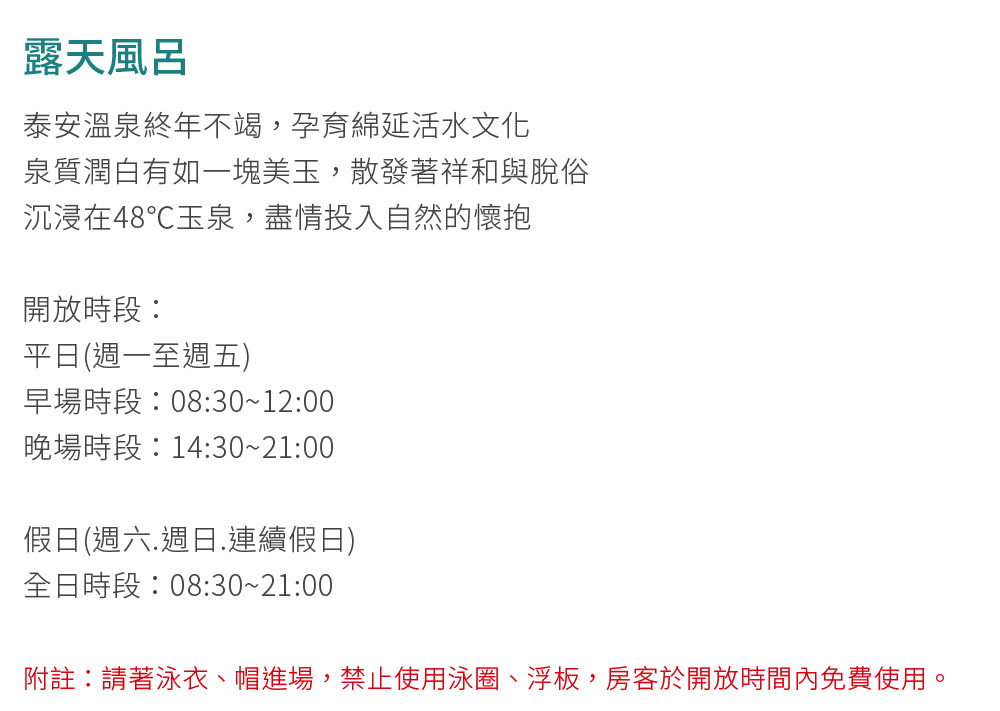 泰安【湯悅溫泉會館】露天風呂平日單人泡湯優惠
