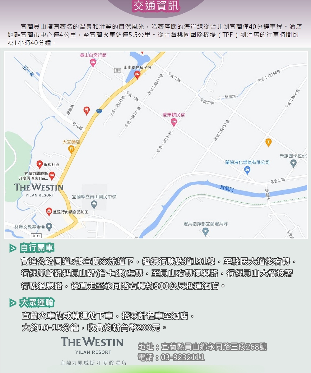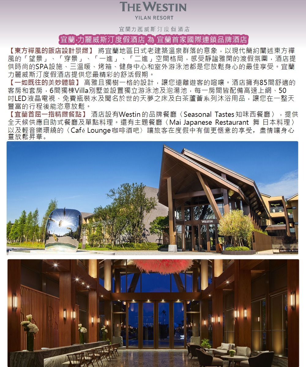 宜蘭力麗威斯汀度假酒店為宜蘭首家國際連鎖品牌酒店。 【東方禪風的飯店設計景緻】以宜蘭地區日式老建築溫泉群落的意象,以現代簡約闡述東方禪風的「望景」、「穿景」、「一進」、「二進」空間格局,感受靜謐雅閑的度假氛圍,酒店提供時尚的SPA設施、三溫暖、烤箱、健身中心和室外游泳池都是您放鬆身心的最佳享受。宜蘭力麗威斯汀度假酒店提供您最精彩的舒活假期。 【一如既往的美妙體驗】高雅且獨樹一格的設計,讓您遠離遊客的喧嚷。酒店擁有85間舒適的客房和套房,6間獨棟Villa別墅並設置獨立游泳池及泡湯池,每一房間皆配備高速上網、50吋LED液晶電視、免費瓶裝水及聞名於世的天夢之床及白茶蘆薈系列沐浴用品,讓您在一整天豐富的行程後能恣意放鬆。【宜蘭首屈一指精緻餐點】酒店設有Westin的品牌餐廳〈SeasonalTastes知味西餐廳〉,提供全天候供應自助式餐廳及單點料理。還有主題餐廳〈Mai JapaneseRestaurant 舞 日本料理〉以及輕音樂環繞的〈CaféLounge咖啡酒吧〉讓旅客在度假中有個更愜意的享受,盡情讓身心靈放鬆昇華。