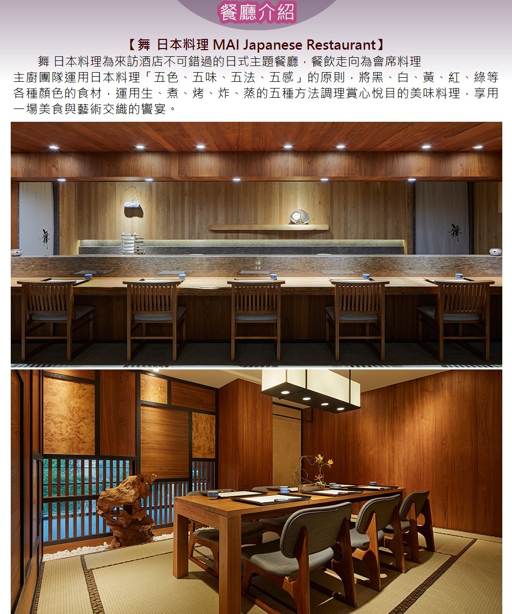 以下餐飲任選:1F咖啡酒吧享雙人下午茶乙客、1F知味西餐廳享單人自助晚餐乙客或假日早午餐兩客、2F舞日本料理享單人節氣會席晚餐乙客或午間定食兩客。