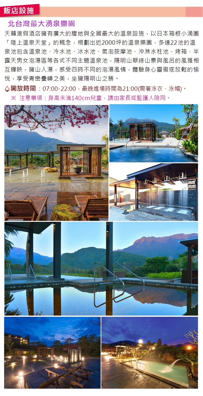 4.露天風呂/SPA水世界營業時間:07:00~22:00,最晚進場時間為21:00。用餐預約專線:02-2408-0000分機1225。