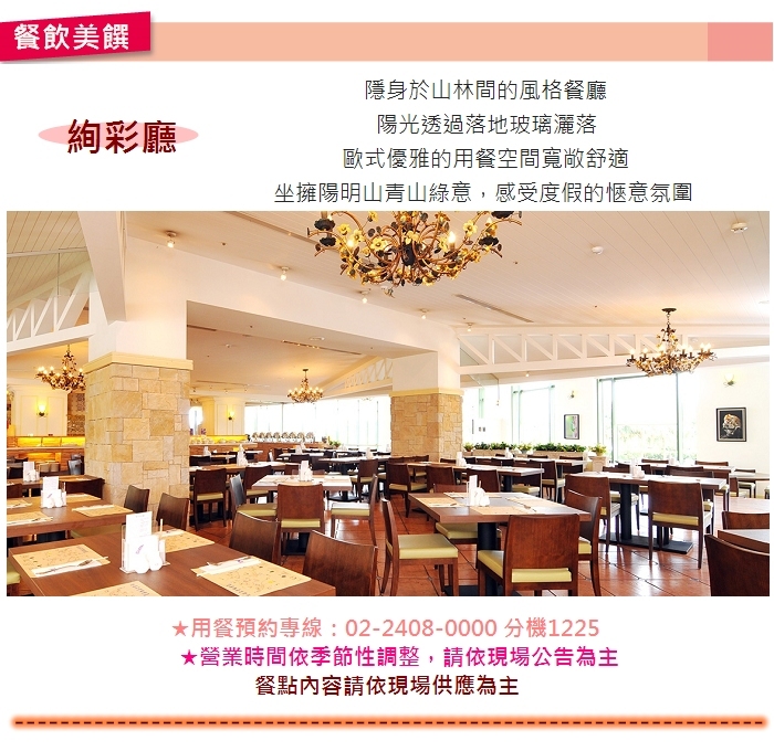 4.露天風呂/SPA水世界開放時間:07:00~22:00,最晚進場時間為21:00/絢彩廳:11:30-14:00。用餐預約專線:02-2408-0000分機1225。