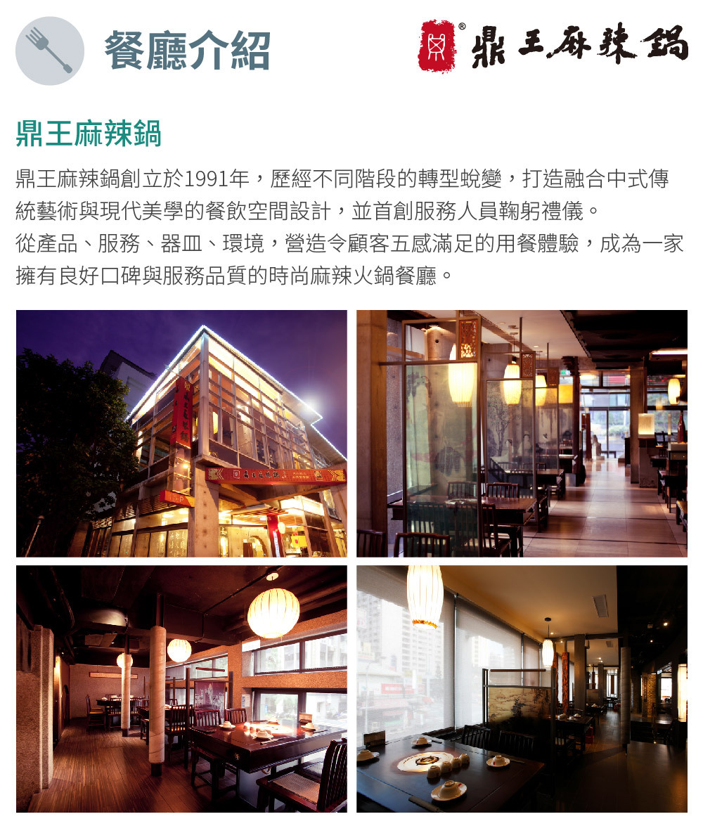 台灣經典麻辣火鍋、超人氣指標名店。鼎王以「中國美食文化開發」為使命,提供您道地美食、體貼服務、舒適空間。