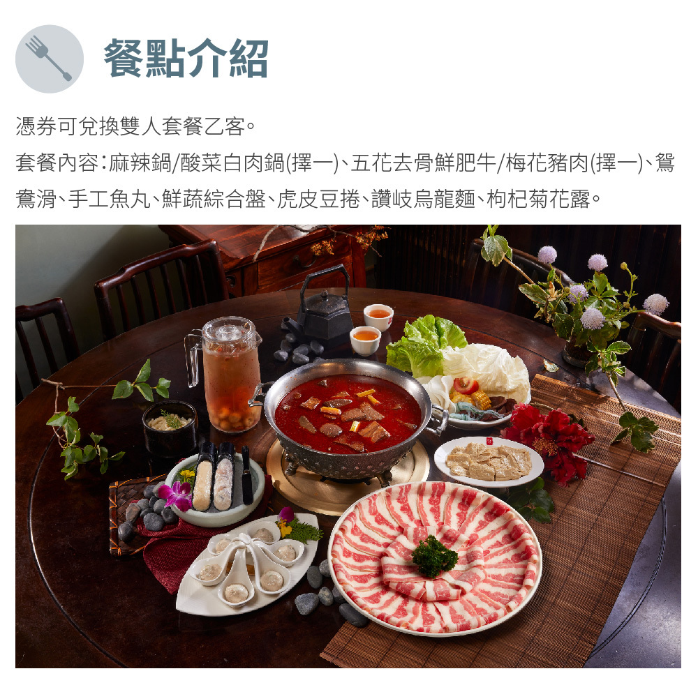 套餐內容:麻辣鍋/酸菜白肉鍋(擇一)、五花去骨鮮肥牛/梅花豬肉(擇一)、伊比利豬嫩肩胛、香滷毛肚、鴛鴦滑、手工魚丸、鮮蔬綜合盤、虎皮豆捲、讚岐烏龍麵、綜合菇、枸杞菊花露。