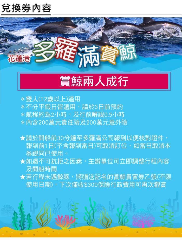 1. 單張券可雙人(12歲以上)搭乘多羅滿號賞鯨船,航程為2小時,及行前解說0.5小時,內含200萬元責任險及200萬元意外險。