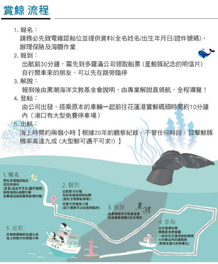 6. 行程均不含交通接送,賞鯨流程:須先至公司報到,再自行開車去賞鯨碼頭(車程約十分鐘內)