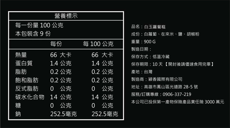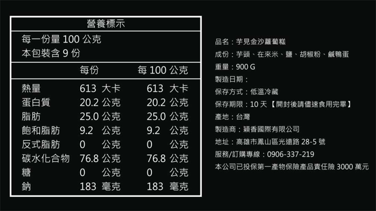 1. 成份:芋頭、在來米、鹽、胡椒粉、鹹鴨蛋