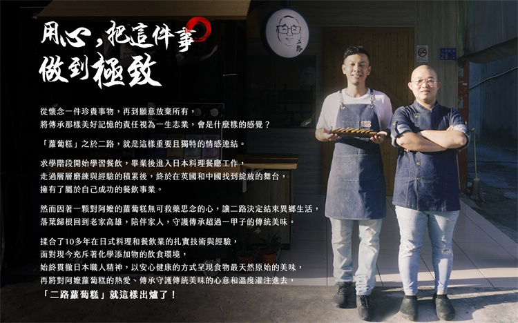 揉合了10多年在日式料和餐飲業的扎實技術與經驗,面對現今充斥著化學添加物的飲食環境,始終貫徹日本人精神、安心健康的方式呈現食物天然原始的美味,再將對阿嬤蘿蔔糕的熱愛、傳承守護傳統美味的心意溫度灌注進去,「二路蘿蔔糕」就這樣出爐了!