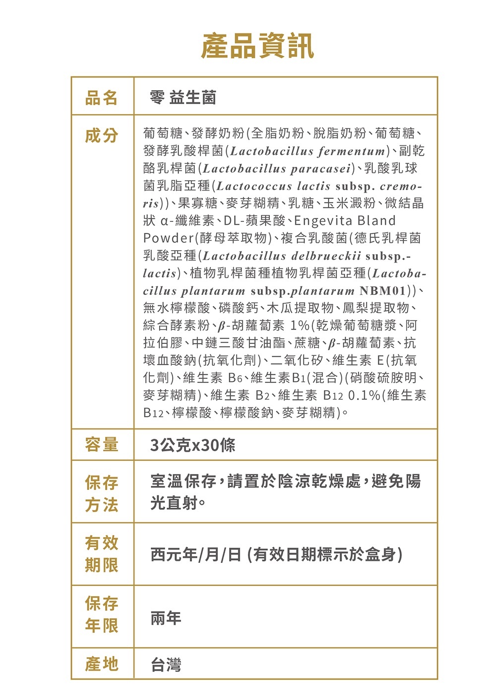 2. 商品規格: 活性乳酸菌菌種組成: • Lactobacillus plantarum subsp. plantarum NBM01 植物乳桿菌種植物乳桿菌亞種 • Lactobacillus delbrueckii subsp. lactis NBM04 德氏乳桿菌乳酸亞種 成分:葡萄糖、發酵奶粉(全脂奶粉、脫脂奶粉、葡萄糖、發酵乳酸桿菌(Lactobacillus fermentum)、副乾酪乳桿菌(Lactobacillus paracasei)、乳酸乳球菌乳脂亞種(Lactococcus lactis subsp. cremoris))、果寡糖、麥芽糊精、乳糖、玉米澱粉、微結晶狀 α-纖維素、DL-蘋果酸、Engevita Bland Powder(酵母萃取物)、活性乳酸菌(德氏乳桿菌乳酸亞種(Lactobacillus delbrueckii subsp.lactis)、植物乳桿菌種植物乳桿菌亞種(Lactobacillus plantarum subsp.plantarum NBM01))、無水檸檬酸、磷酸鈣、木瓜提取物、鳳梨提取物、綜合酵素粉、β-胡蘿蔔素 1%(乾燥葡萄糖漿、阿拉伯膠、中鏈三酸甘油酯、蔗糖、β-胡蘿蔔素、抗壞血酸鈉(抗氧化劑)、二氧化矽、維生素 E(抗氧化劑)、維生素 B6、維生素B1(混合)(硝酸硫胺明、麥芽糊精)、維生素 B2、維生素 B12 0.1%(維生素 B12、檸檬酸、檸檬酸鈉、麥芽糊精)。 有效日期:標示於貼紙(西元年/月/日),未開封兩年