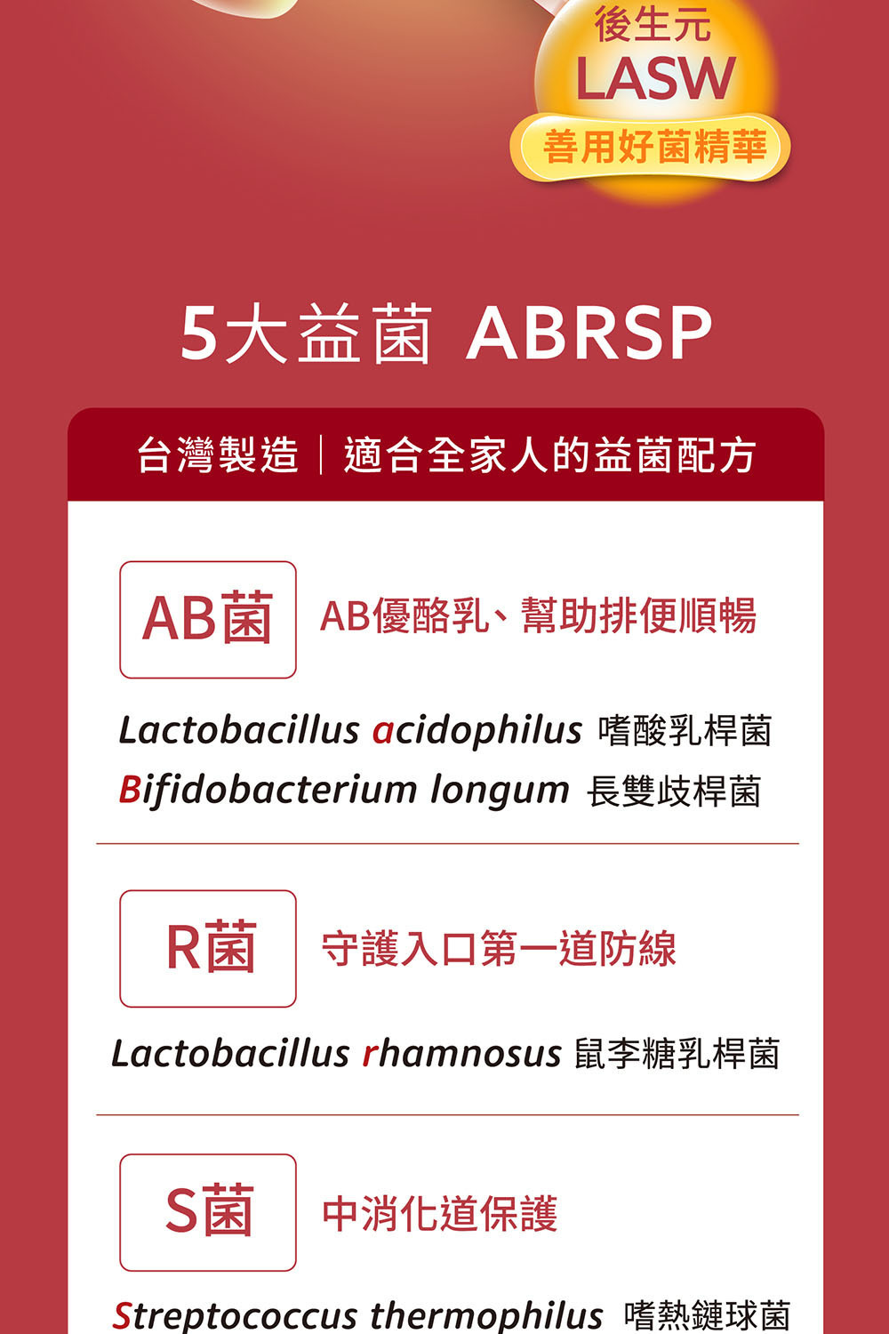 • 5 種益菌 ABRSP+益生元 (果寡糖 Synergy1)+後生元 (LASW)