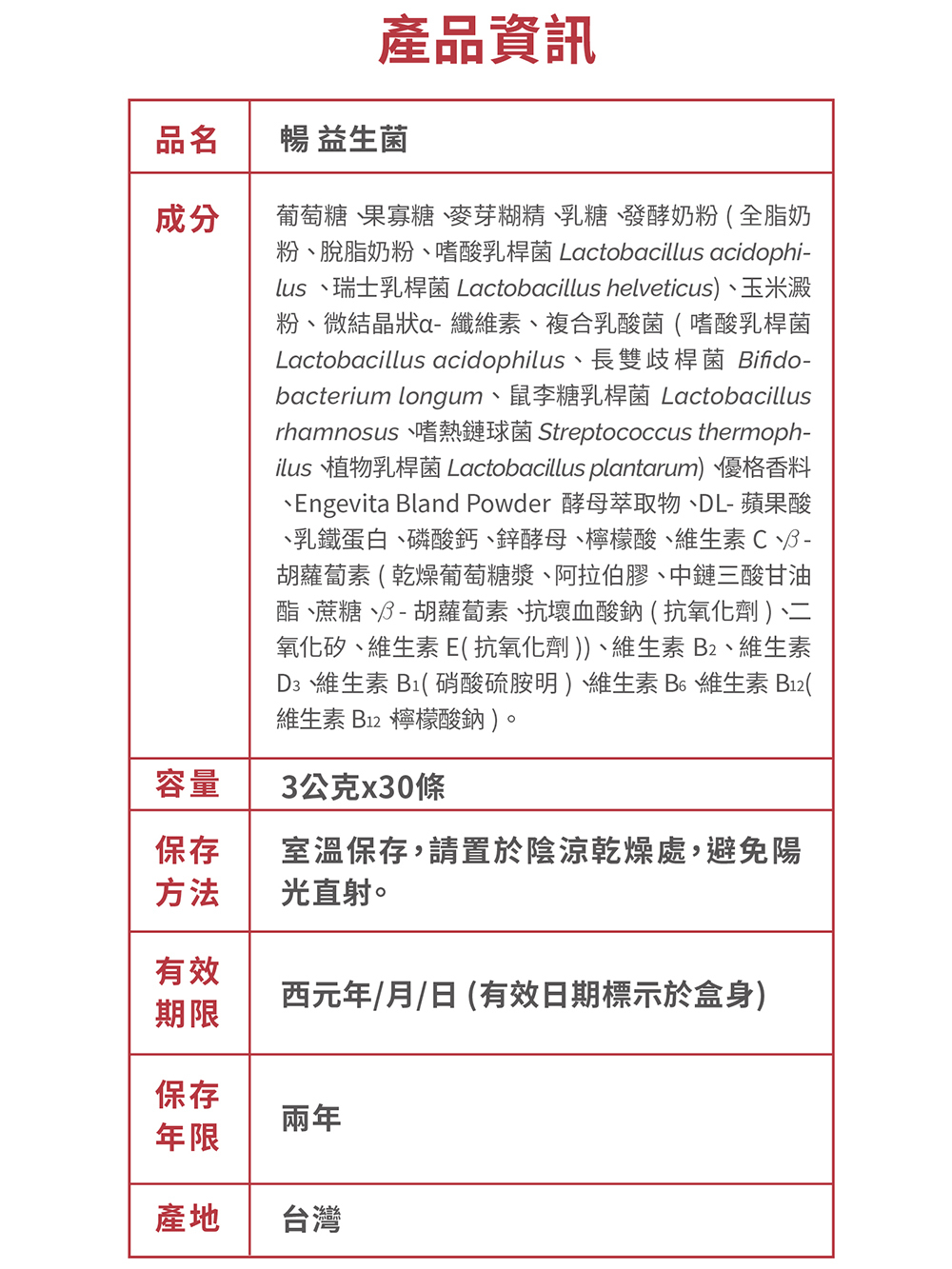 活性乳酸菌菌種組成: Lactobacillus acidophilus 嗜乳酸桿菌 Bifidobacterium longum 比菲德氏長雙歧桿菌 Lactobacillus rhamnosus 鼠李糖乳桿菌 Streptococcus thermophilus 嗜熱鏈球菌 Lactobacillus plantarum subsp. Plantarum 植物乳桿菌 成分:葡萄糖、果寡糖、麥芽糊精、乳糖、發酵奶粉(全脂奶粉、脫脂奶粉、嗜酸乳桿菌Lactobacillus acidophilus、瑞士乳桿菌Lactobacillus helveticus)、玉米澱粉、微結晶狀 α-纖維素、複合乳酸菌(嗜酸乳桿菌Lactobacillus acidophilus、長雙歧桿菌Bifidobacterium longum、鼠李糖乳桿菌Lactobacillus rhamnosus、嗜熱鏈球菌Streptococcus thermophilus、植物乳桿菌Lactobacillus plantarum)、優格香料、Engevita Bland Powder 酵母萃取物、DL-蘋果酸、乳鐵蛋白、磷酸鈣、鋅酵母、檸檬酸、維生素C、β-胡蘿蔔素(乾燥葡萄糖漿、阿拉伯膠、中鏈三酸甘油酯、蔗糖、β-胡蘿蔔素、抗壞血酸鈉(抗氧化劑)、二氧化矽、維生素 E(抗氧化劑))、維生素B2、維生素D3、維生素 B1(硝酸硫胺明)、維生素 B6、維生素B12 (維生素B12、檸檬酸鈉)。